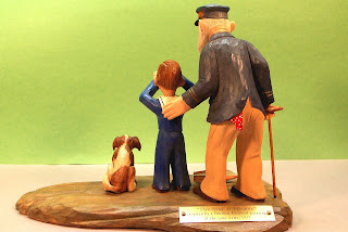 Somehow I needed a way to tell the viewer what was going on in this piece and why they were looking at the *backsides* of these guys. So I gave the grandson a old fashioned "spyglass" and his very own sailboat. The dog is sitting down because I couldn't figure out how to carve such skinny little legs on the cross-grain.