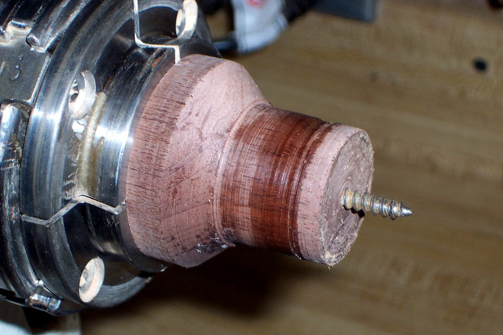 The first chuck is 1" in diameter to fit the hole that is drilled into the bottom ("body") block. The second one is 1.25" in diameter to fit into the top ("roof") block. Since it is considered "bad form" to show up at the local wood turner's club (or anywhere else for that matter) with bloodied knuckles, when you make your chucks be sure to make the "neck" on each of them long enough ensure that the rotating lathe chuck jaws can't scuff up your knuckles while you're turning or sanding.