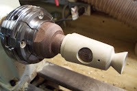So, I ended up turning two "Jam Chucks" to hold the two pre-drilled blocks, one for the roof and one for the "body" of the house. Strictly speaking, I guess these aren't really "Jam Chucks" because a true jam chuck uses only friction to hold the wood and these have an internal, hidden screw to lock everything down. So, for the purpose of this blog I guess these should be considered "Screw Chucks" although I have never seen that expression used.